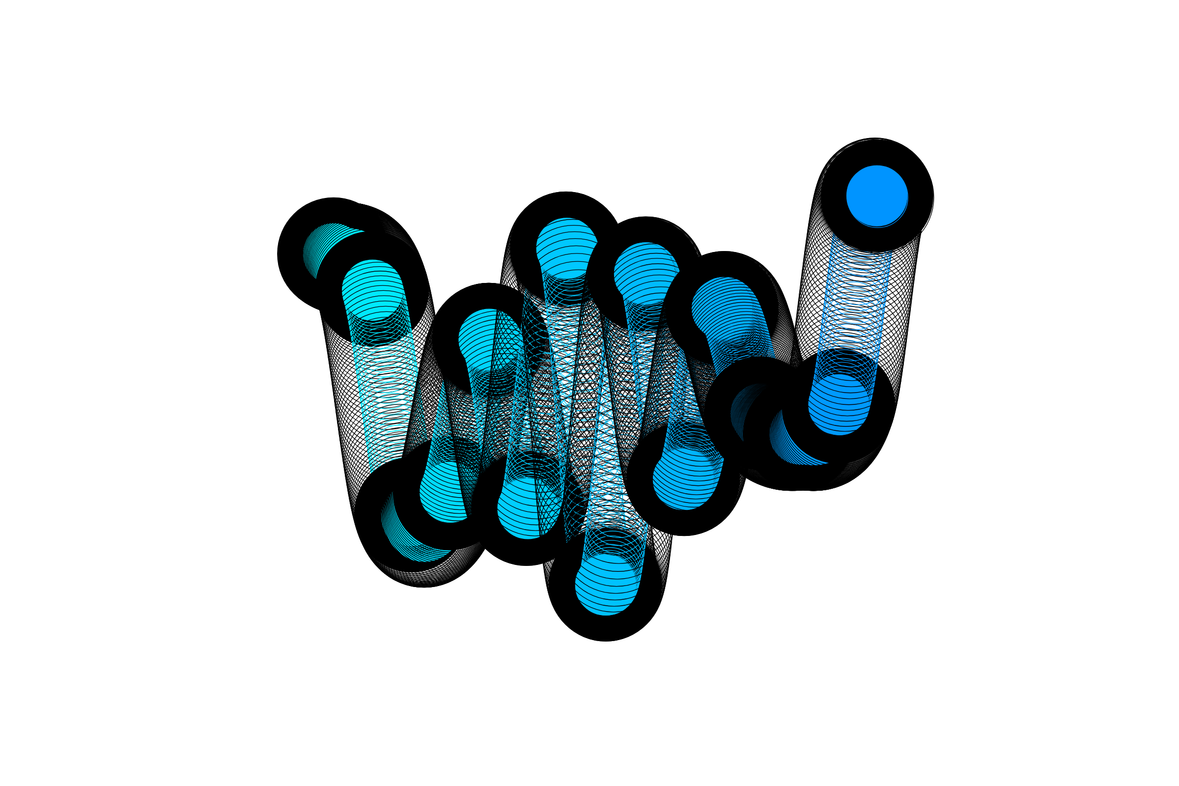 snowfro“Pipe Squiggles are the only squiggles that clearly mark each of the segments that are used for controlling color as it progresses through the length of the piece. This one, with a very slow gradation from start to finish in the aqua to sky blue range, demonstrates that more acutely than others.”