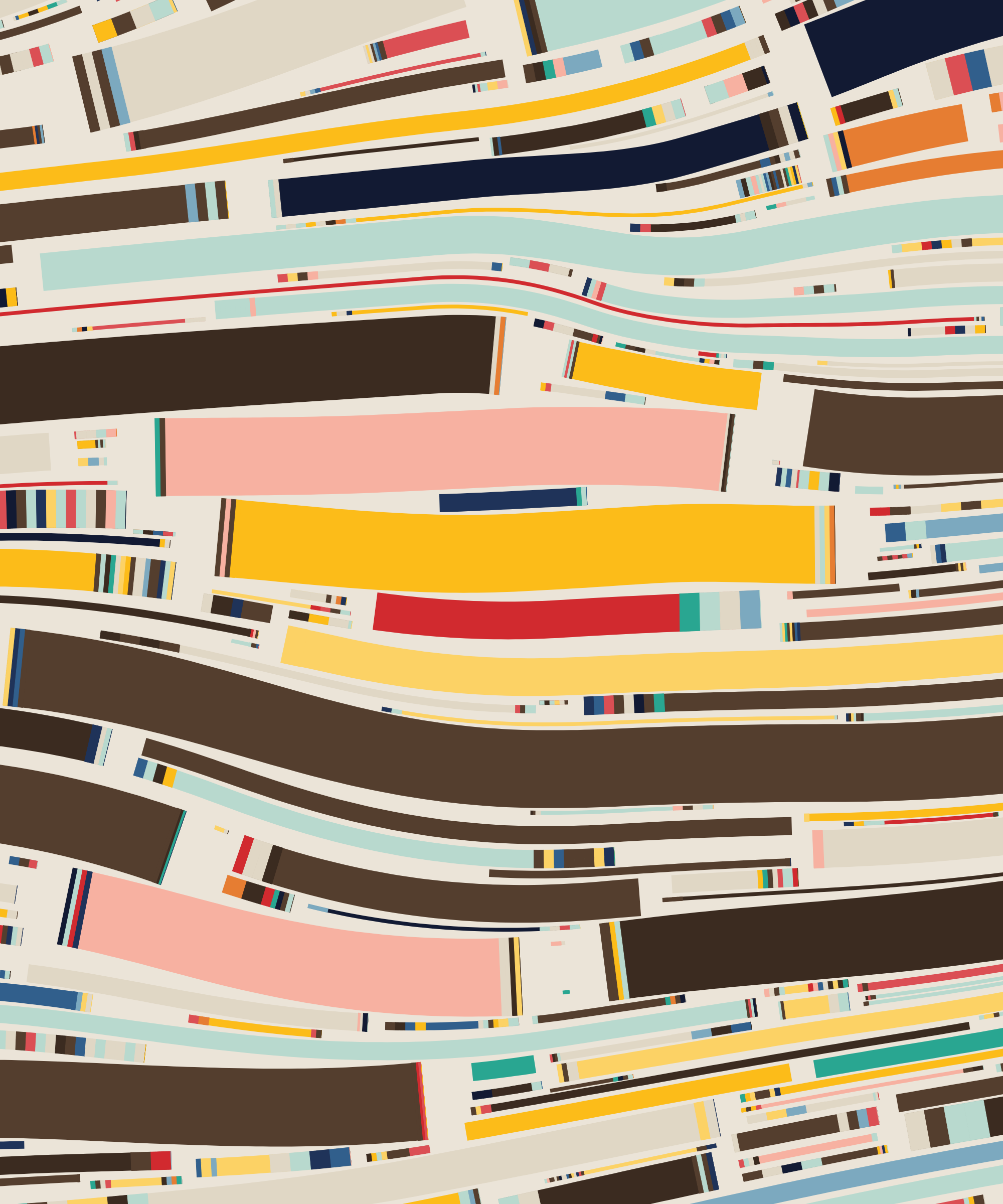 Fidenza is by far my most versatile algorithm to date. Although the program stays focused on structured curves and blocks, the varieties of scale, organization, texture, and color usage it can employ create a wide array of generative possibilities.
