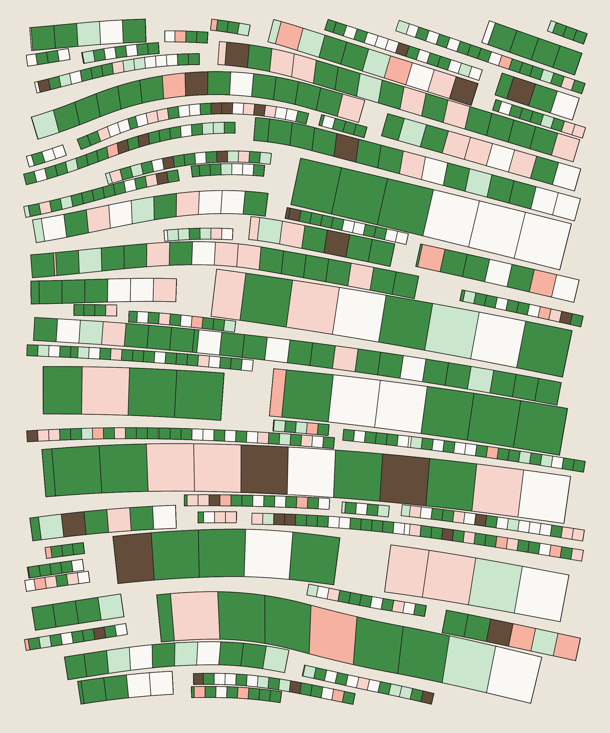 Fidenza is by far my most versatile algorithm to date. Although the program stays focused on structured curves and blocks, the varieties of scale, organization, texture, and color usage it can employ create a wide array of generative possibilities.