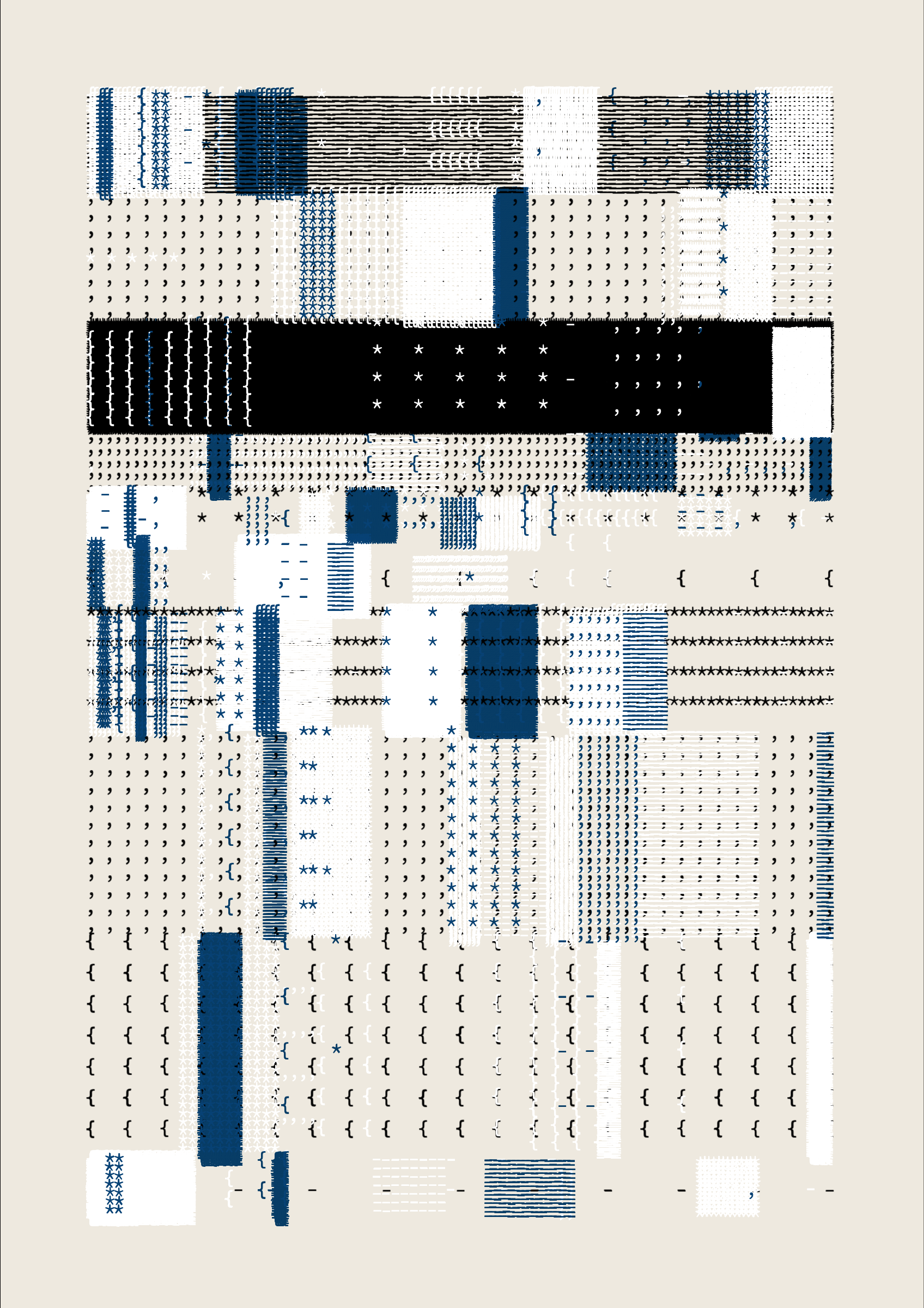 FOLIO is a generative drawing system, inspired by concrete poetry and early computer artwork, that emits an output process for a given input. Each output may be realized digitally, in print, or through another medium. The drawing system, coded in JavaScript, recursively packs bins of data to fill the page, constrained entirely by the use of typographic glyphs and a limited mono-, duo-, or tri-colour palette.