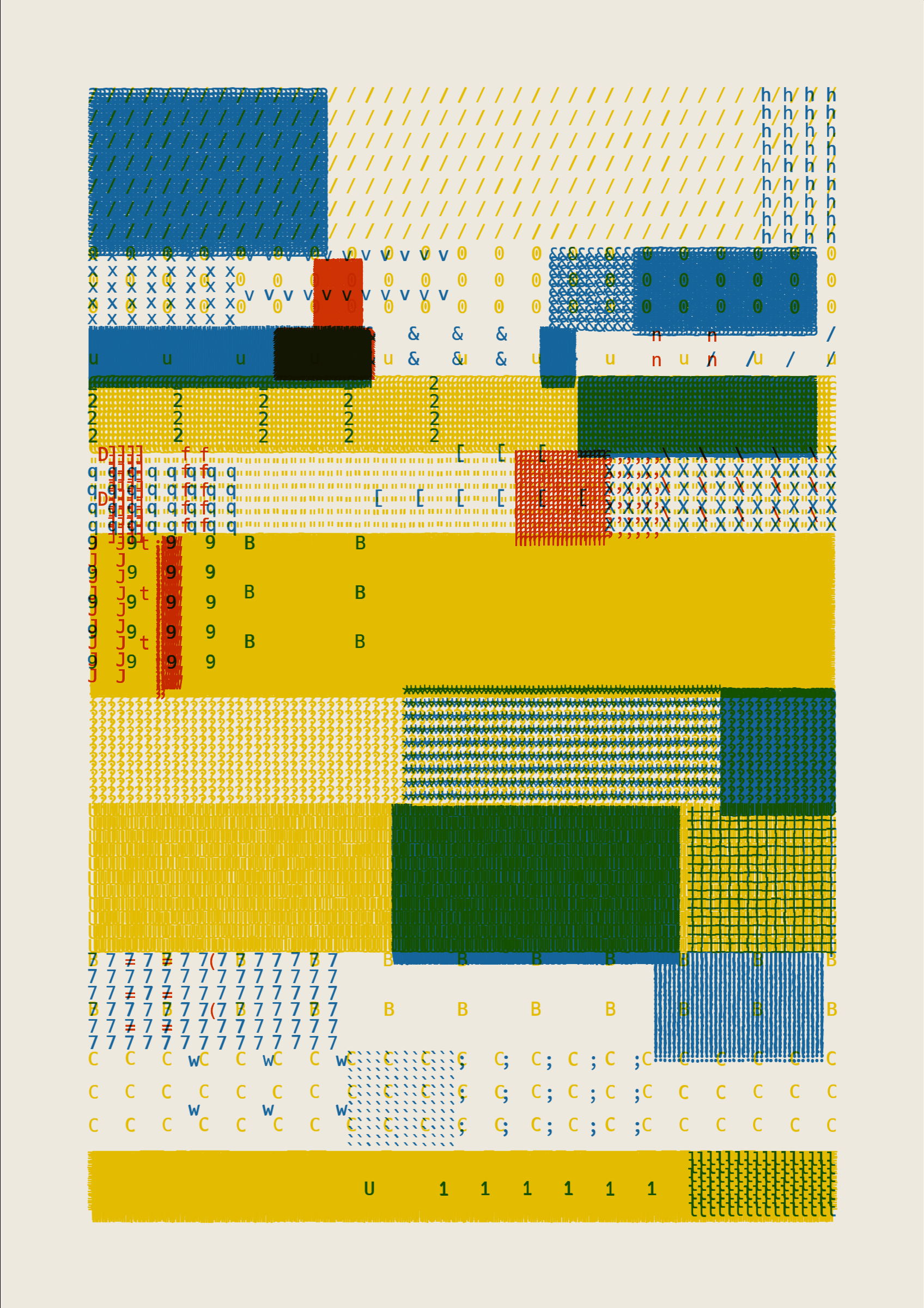 FOLIO is a generative drawing system, inspired by concrete poetry and early computer artwork, that emits an output process for a given input. Each output may be realized digitally, in print, or through another medium. The drawing system, coded in JavaScript, recursively packs bins of data to fill the page, constrained entirely by the use of typographic glyphs and a limited mono-, duo-, or tri-colour palette.
