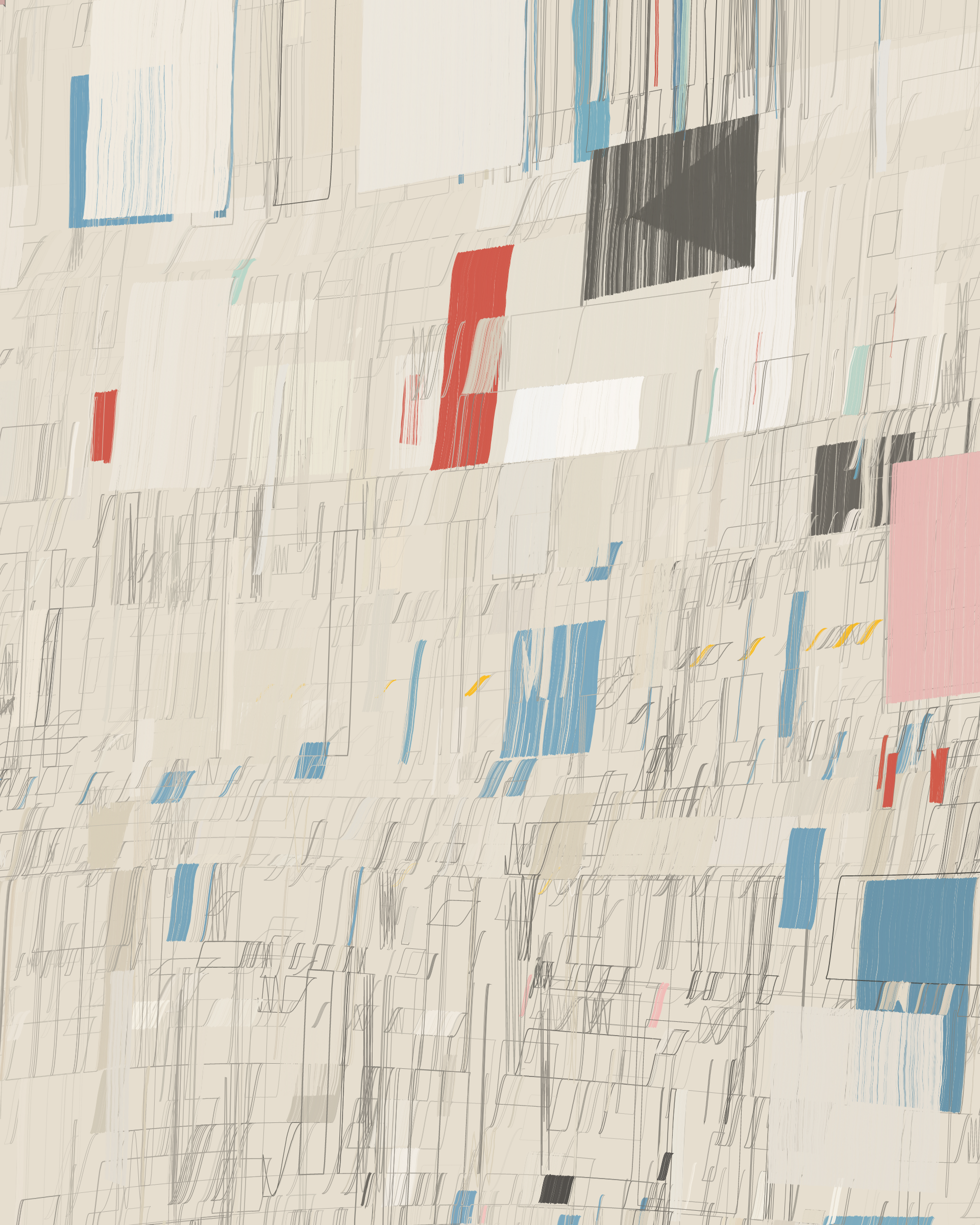 tyler hobbs“IC #55 demonstrates a couple of the features from the algorithm well. One idea I was interested in was the "painting over" of lower layers, to partially erase or obscure them. This is something you see often in urban environments, where grafitti is painted over with a neutral color over and over, creating a patchwork that is interesting for its own abstract reasons. Additionally, there were several bugs in the IC code that I decided to leave in the final algorithm. One of those is responsible for the black triangle in the upper-right corner. Mistakes are often a valuable component of visual artwork. The computer and code tend to make very idiosyncratic mistakes, and so leaving these mistakes in keeps the work well connected to the medium.”
