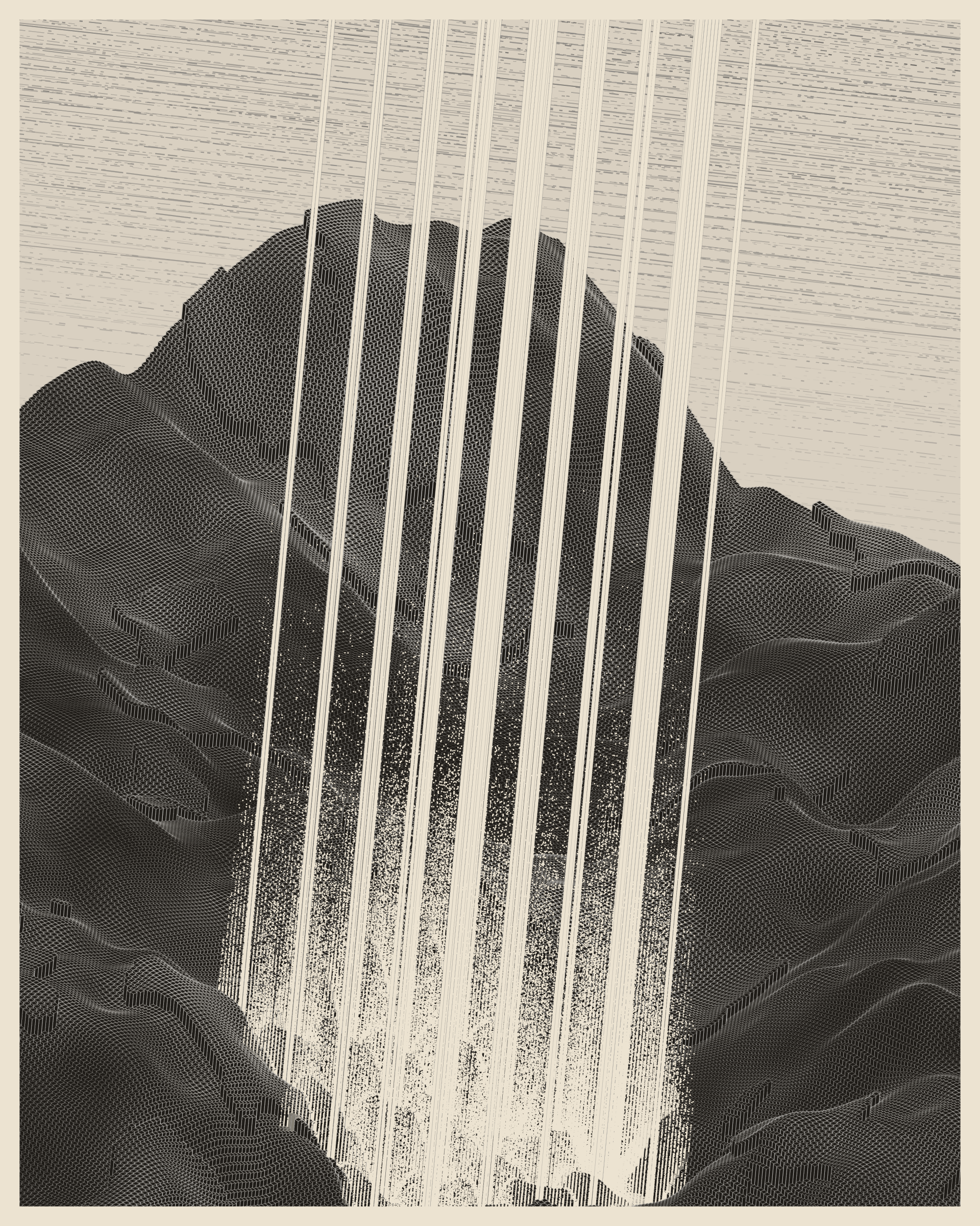 The Caretaker awakes. After a millennia of slumber it must again usher its minions into the expanse. It must sustain. It must replenish. So it guides its horde out to the stars, visiting countless worlds to restart the cycle. For an eternity the cycle has repeated, minding and tending this garden of worlds. Now it is time for the garden to give back. This event has come to be known as *The Harvest*.*The Harvest* depicts worlds that exist in eternal symbiosis with the Caretaker. We witness the spectacle of monumental chromatic beams as they impact the surface of these beautiful, alien bodies. The Caretaker assigns different constellations to each planet, giving rise to unique combinations of beams as they extract the much needed nectar. This project has been inspired by a life-long fascination for science fiction and space exploration. Aiming to capture a moment of awe, the beams reach to their origin, emulating a cathedral-like atmosphere in the vein of Hugh Ferriss, while borrowing inspiration from Micheal Whelan’s landscapes. All in the effort of capturing a sense of how small we are in relation to the cosmos.*The Harvest* is built on p5js, and takes advantage of its 3d api. With the orthogonal view enabled, the algorithm uses volumetric rectangular units to create the stylised illusion of alien landscapes. Each beam has a position, color, reach and yield that is calculated and procedurally drawn over time.