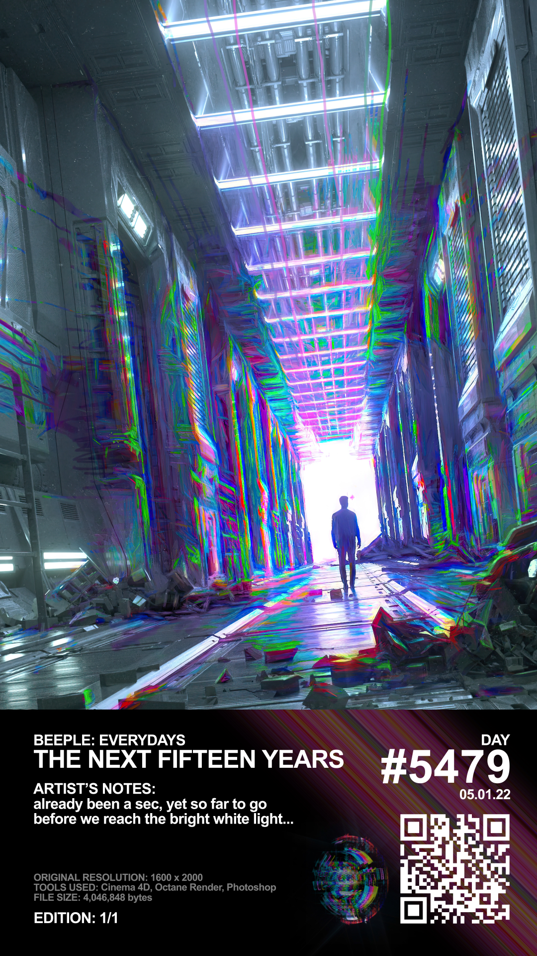 beeple“This is the first everyday after having just completed 15 years of everydays. I was obviously still trying to process that milestone as well as what lied ahead. It was done at a point that was extremely hectic and stressful as I was going on the Tonight Show to do my everyday the next day. I wanted to make a work that showed a person (me) on a long complex path who had already gone some distance with aways to still go and a messy, colorful, psychadelic, imperfect path left in his wake.”